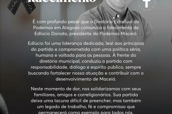 O falecimento de Edlúcio Donato, presidente do Podemos em Maceió, gerou uma onda de condolências entre os políticos de Alagoas. Donato, um importante nome da política local, faleceu recentemente, deixando um legado que será lembrado por muitos.