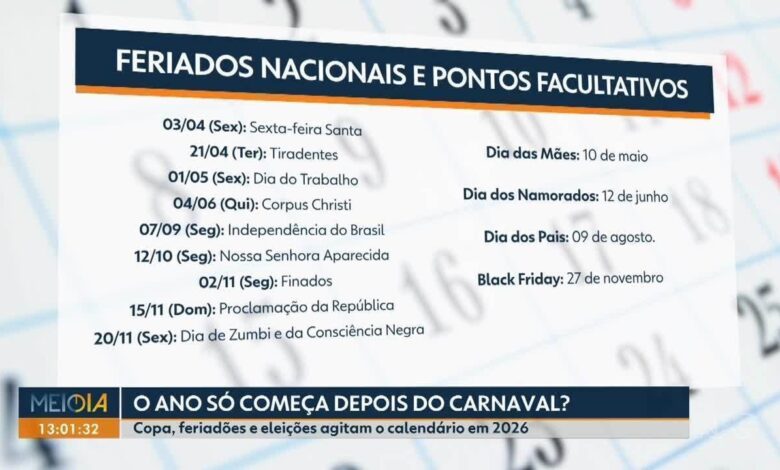 Calendário 2026: Feriados incluem Copa do Mundo e Eleições.