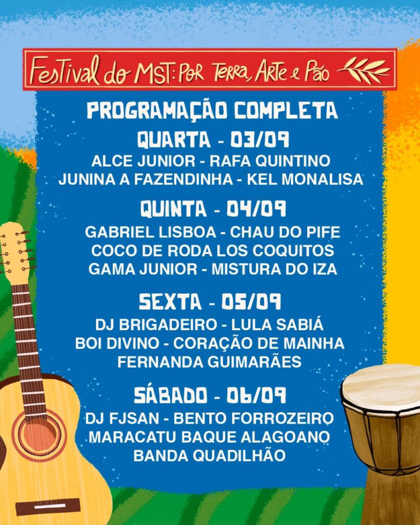 A Feira da Reforma Agrária do Movimento dos Trabalhadores Rurais Sem Terra (MST) em Alagoas promove, neste ano, o evento "Festival por Terra, Arte e Pão". A programação é marcada pela presença de diversos artistas locais, tornando-se um ponto de encontro cultural e de valorização das práticas agrícolas sustentáveis.